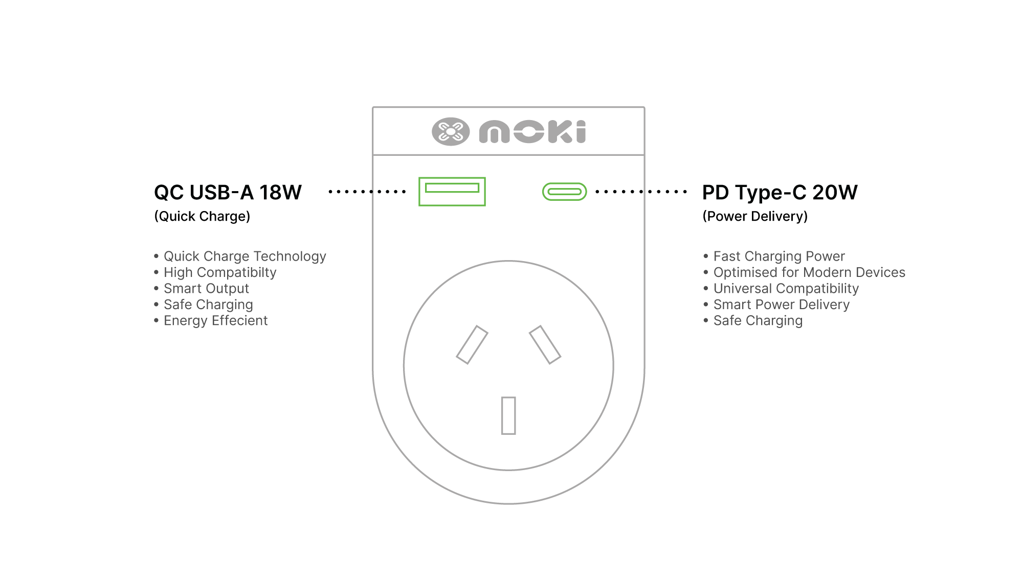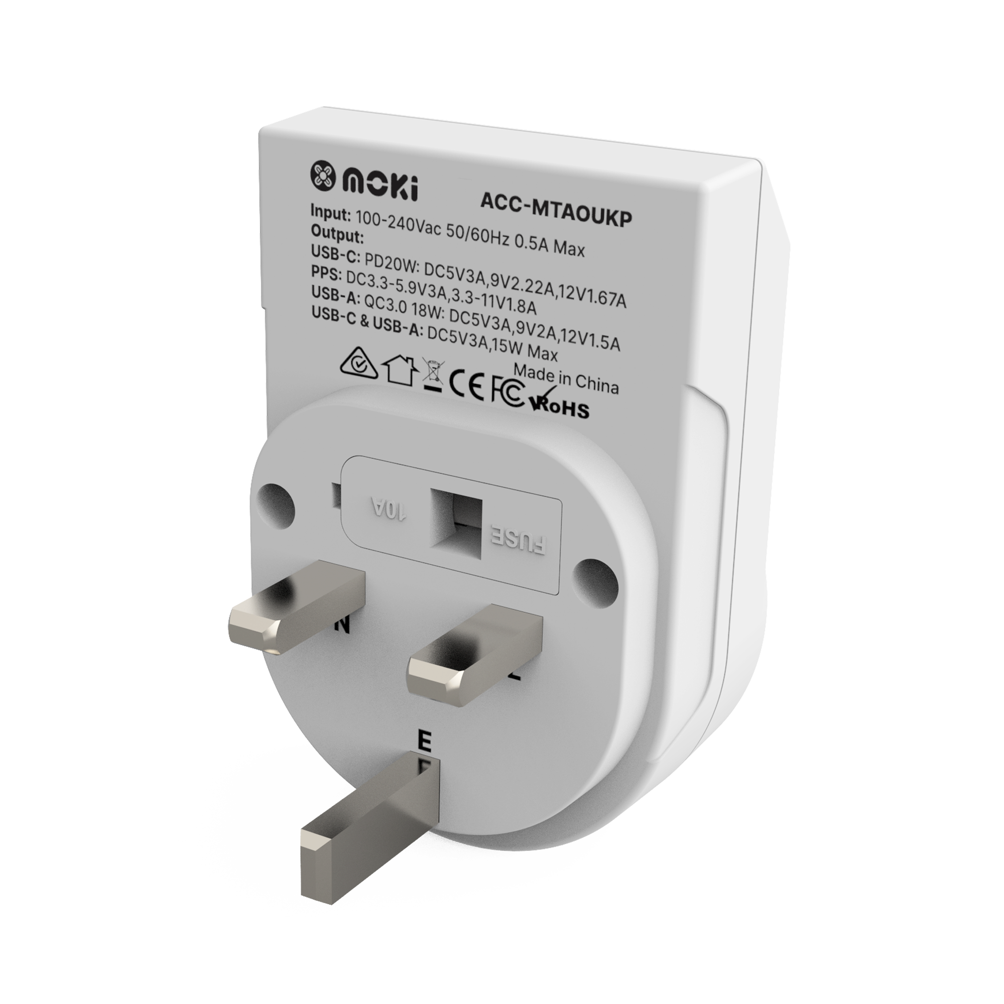 Outbound AU/NZ to UK Travel Adaptor PLUS adapts Australian and New Zealand plugs for use in UK (Plug Type G). Each model features a PD 20W USB-C port for fast-charging compatible devices and a QC 3.0 USB-A port for rapid charging. Perfect for if you're heading overseas, the Moki Travel Adaptor Plus provides a convenient and efficient charging option.