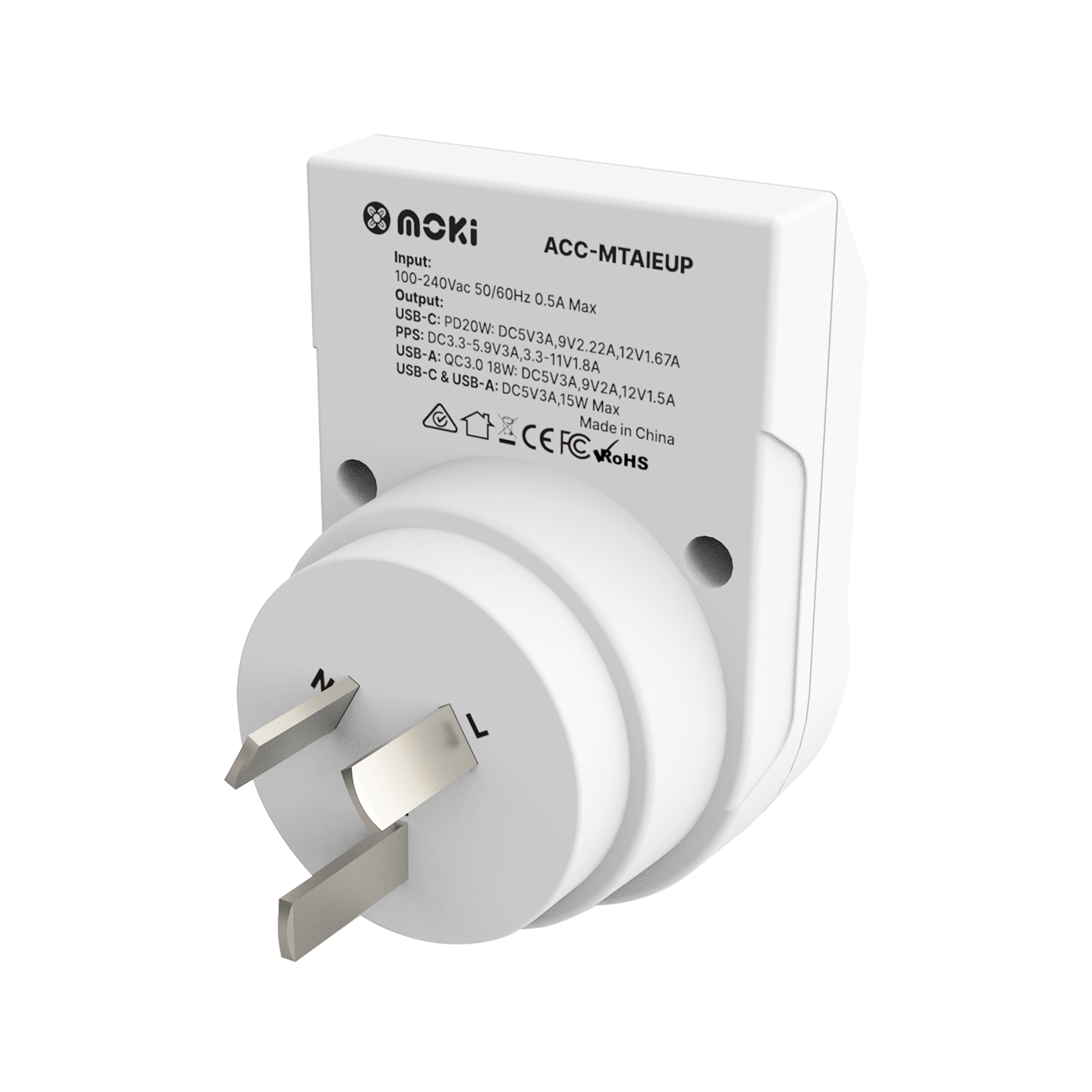 Inbound Europe to AU/NZ Travel Adaptor PLUS converts Europe plugs for use in Australia and New Zealand (Plug Type i). Each model features a PD 20W USB-C port for fast-charging compatible devices and a QC 3.0 USB-A port for rapid charging. Perfect if you're needing a reliable solution for visitors using foreign devices in Australia and New Zealand, the Moki Travel Adaptor Plus provides a convenient and efficient charging option.